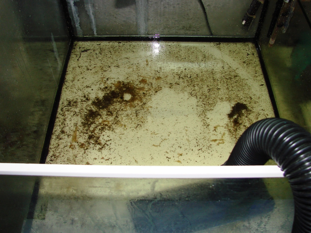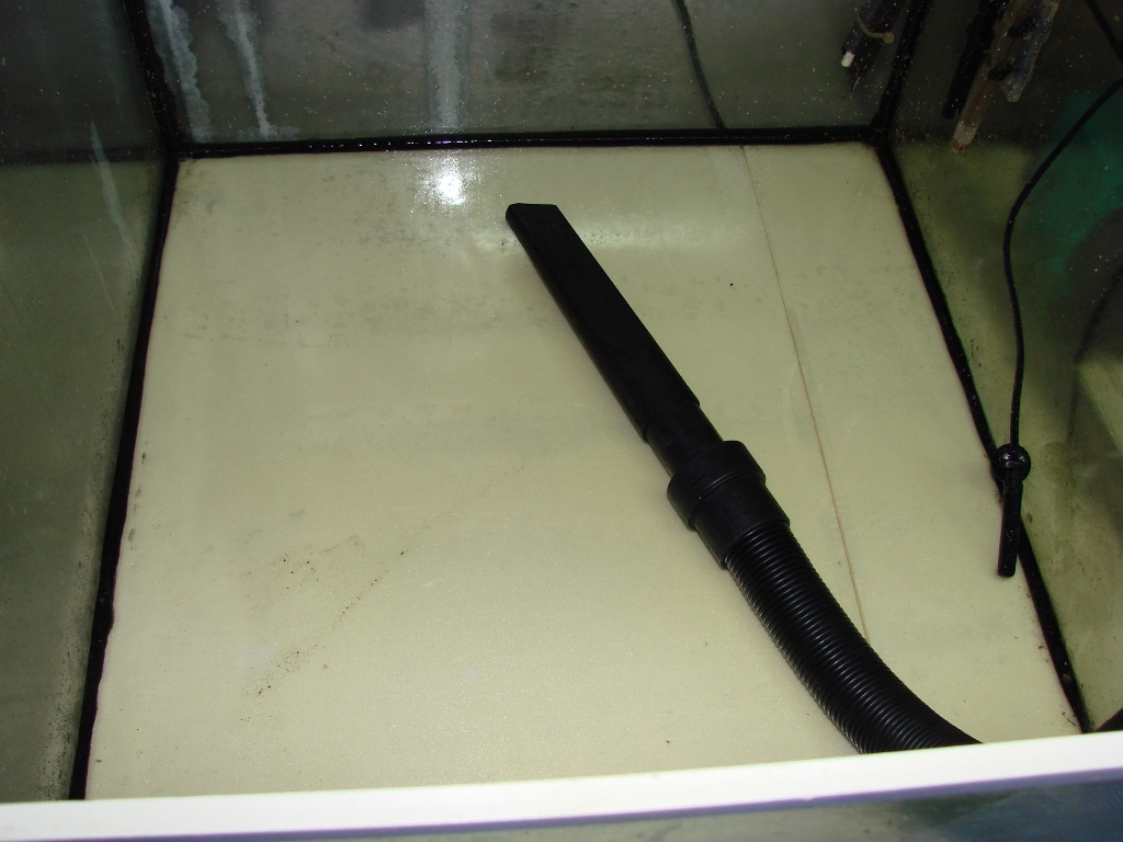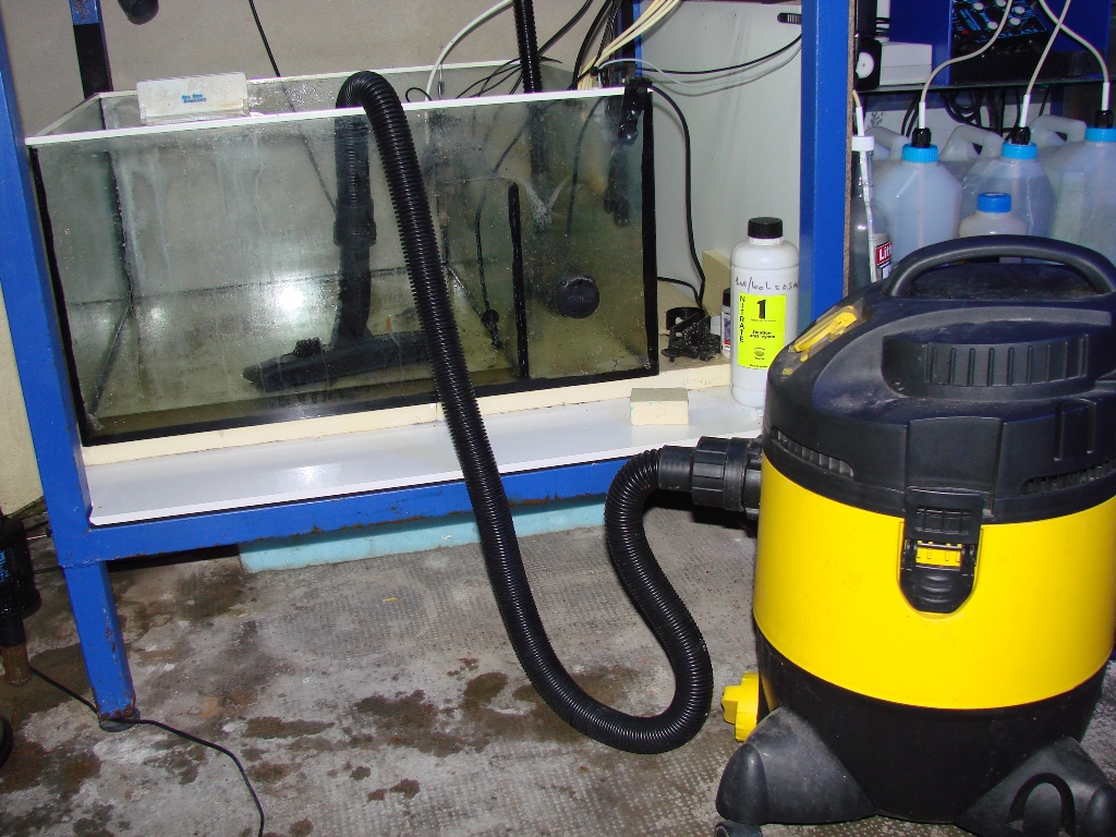 Dans le cas ci-dessous, la majorité des changements d’eau se fait par la cuve de décantation.  L’évacuation se fait directement vers l’égout mais il reste toujours un fond de cuve où les sédiments qui ont échappés à la filtration mécanique viennent se déposer. Par exemple, un aspirateur à eau genre industriel bas de gamme rendra de bons services pour une somme modique.