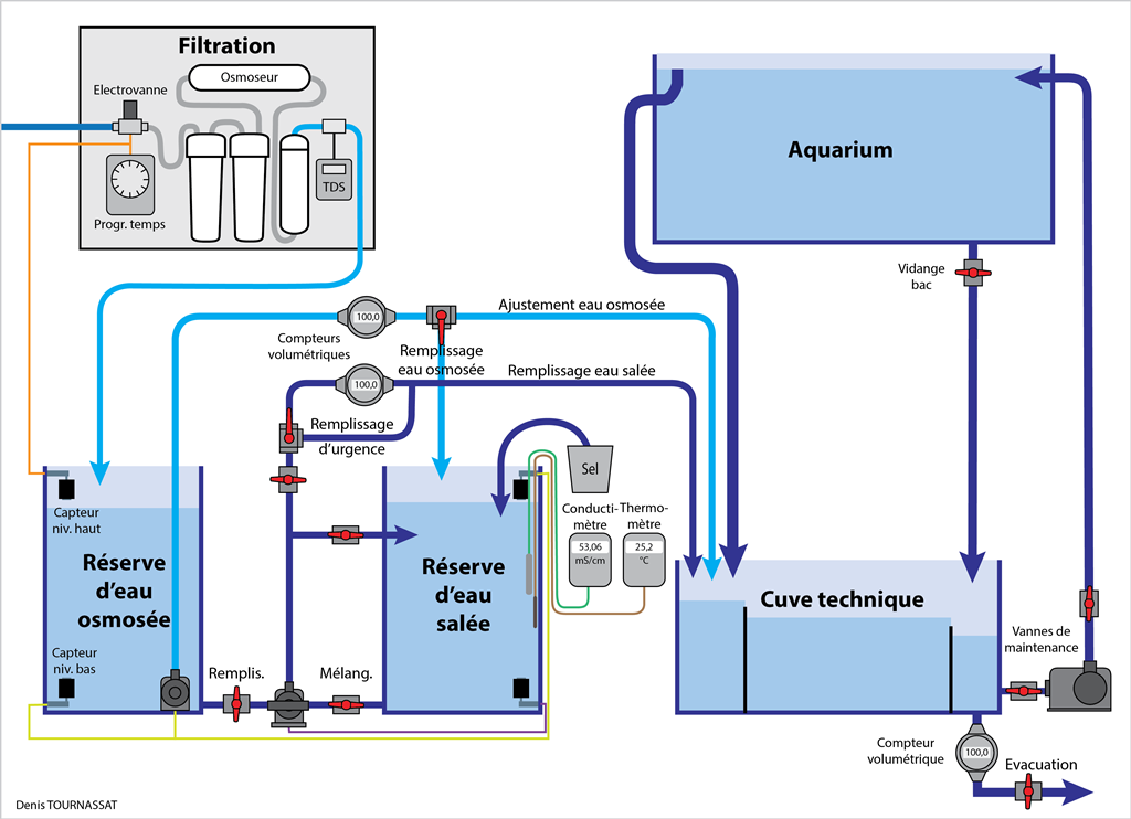 La cuve nettoyée et les accessoires remis en place, le remplissage peut commencer. Une fois le niveau atteint, la circulation pourra être rétablie sans avoir perturbé les animaux de la cuve principale.