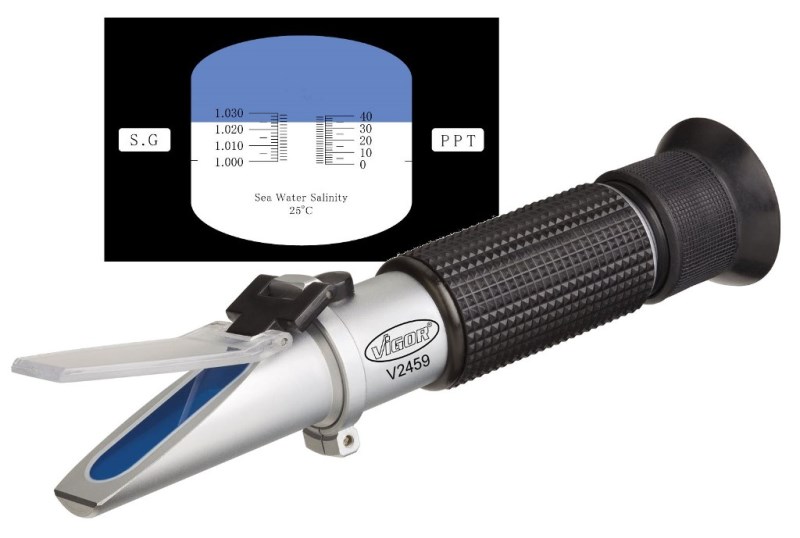 Il est préférable de se fier à la salinité (S) lue sur les appareils de mesure plutôt qu’à la « densité », qui est souvent une source de confusion. La densité en anglais se dit « specific gravity » (SG) ou « relative gravity » alors que la masse volumique se dit « density ». Ces deux valeurs ne sont pas calculées de la même façon. Pour une d’eau de mer à 25°C et à une salinité de 35  :