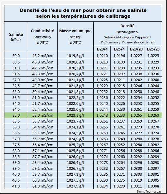 - Aréomètre – Densimètre D20/20 : 1,0265. Il en est de même avec de nombreux réfractomètres D20/20 bien que ces équipement donnant directement la salinité, toute conversion est inutile.