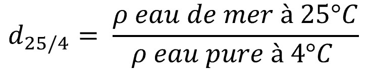 Concernant le milieu marin, c’est le rapport entre la masse volumique (ρ) de l’eau de mer et celle de l’eau de référence.