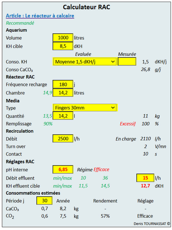 Les réglages du pH et du débit peuvent se réaliser par approximations successives selon le test KH dans le bac. Leur calcul anticipé permet cependant de procéder de manière plus pertinente. Tous les calculs qui suivent sont intégrés dans le Calculateur RAC. Il permet de débuter le réglage avec des valeurs cohérentes.